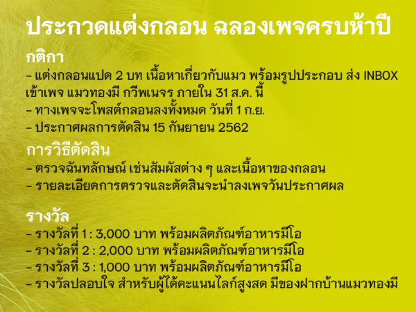 #ประกวดแต่งกลอน ฉลองเพจ แมวทองมี กวีพเนจร ครอบรอบ 5 ปี
