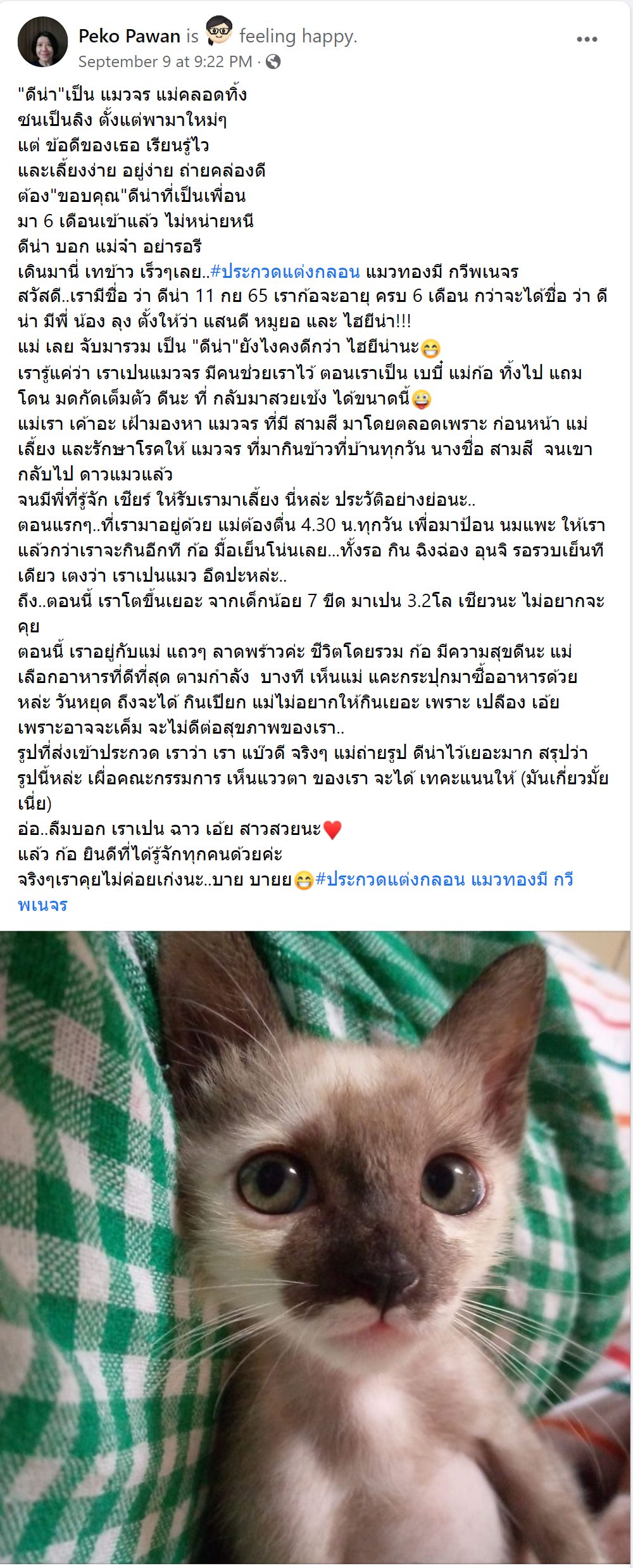 ประกาศผลกิจกรรมการ #ประกวดแต่งกลอน โพสต์เมื่อ 10 ต.ค. 2022 - 15:20น. ใน โพสต์ทั่วไป 0 คอมเมนต์ ประกาศผลกิจกรรมการ #ประกวดแต่งกลอน ครบรอบ 8 ปี เพจ แมวทองมีกวีพเนจร ผลการตรวจตัดสินออกมาเรียบร้อยครับ สำหรับผู้ส่งผลงานเข้าประกวดทั้ง 51 ท่าน มีผู้ชนะการประกวดได้แก่ – รางวัลที่ 1 – รางวัล 2,000 บาท คุณ น้าหนุ่ม น้าหนุ่ม – รางวัลที่ 2 – รางวัล 1,500 บาท คุณ ลูกหมี สีน้ำตาล รางวัลที่ 3 – รางวัล 1,000 บาท คุณ Bow Bogus รางวัลชมเชย 4 รางวัล รางวัลละ 500 บาท – คุณ Mio Tanathip – คุณ เสือ ผา – คุณ Siriluck Puy Angthong ท่านเหล่านี้ ทักพ่อทองมีทางข้อความมานะครับ สำหรับผลการตัดสิน ขอถือสิทธิ์ตัดสินเบ็ดเสร็จเด็ดขาด พ่อทองมีพยายามตรวจตัดสินอย่างละเอียดและยุติธรรม ซึ่งไม่ได้ดูว่าท่านใดเป็นท่านใด ยึดจากผลงานที่ส่งประกวดอย่างเดียวครับ รายละเอียดการตัดสิน เปิดดูในแต่ละรูปจากโพสต์นี้ครับ หากมีข้อข้องใจประการใด สอบถามได้ตลอดเวลานะครับ ขอขอบคุณผู้ที่เข้าประกวดทุกท่าน ขอขอบคุณแฟนเพจที่ติดตาม และขอขอบคุณ Me-O ที่สนับสนุนกิจกรรมนี้อย่างสูงครับ ดูโพสต์ในเฟซบุ๊กShare พิมพ์ 0 Likes