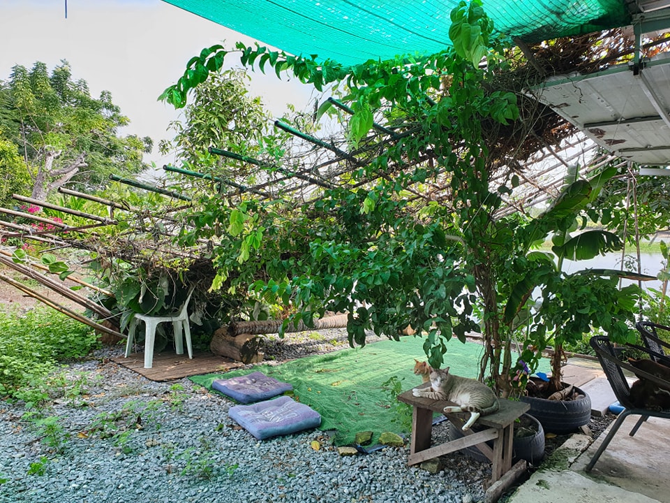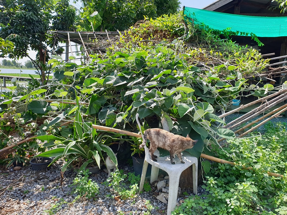 สองวันมานี้ฝนตกหนักและลมแรงเป็นพายุเลยครับ รอบ ๆ บ้านมีต้นไม้ใหญ่ซึ่งก็ตัดยอดให้เตี้ยลงหมดแล้ว แต่ยังเหลือบริเวณสวนสมุนไพรอาจารย์เหมี่ยว บริเวณพื้นจะปลูกตำแยแมวไว้และปูพรมหญ้าเทียมให้แมวมานอนเสพสมุนไพรกัน ส่วนด้านบน พ่อทองมีทำเป็นร้านมีหลังคาให้ผักสวนครัวเลื้อยเพื่อให้ร่มเงาและคนเก็บกินได้ ฝนตกวันก่อนร้านก็เริ่มโยก ยังไม่ทันซ่อม เมื่อวานตกอีกทีนี้พังเลยครับ เพราะทำไว้ไม่แข็งแรงและก็คงถึงเวลาปรับปรุงใหม่ เดี๋ยวจะเปลี่ยนผักเป็นดอกไม้ที่มีลำต้นเลื้อยเป็นร่มเงาได้แทน แมวจะได้มีมุมพักผ่อนและถ่ายรูปสวย ๆ กัน ส่วนผักสวนครัวจะย้ายไปปลูกริมคลองแทนครับ