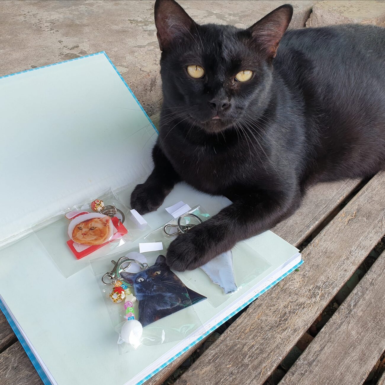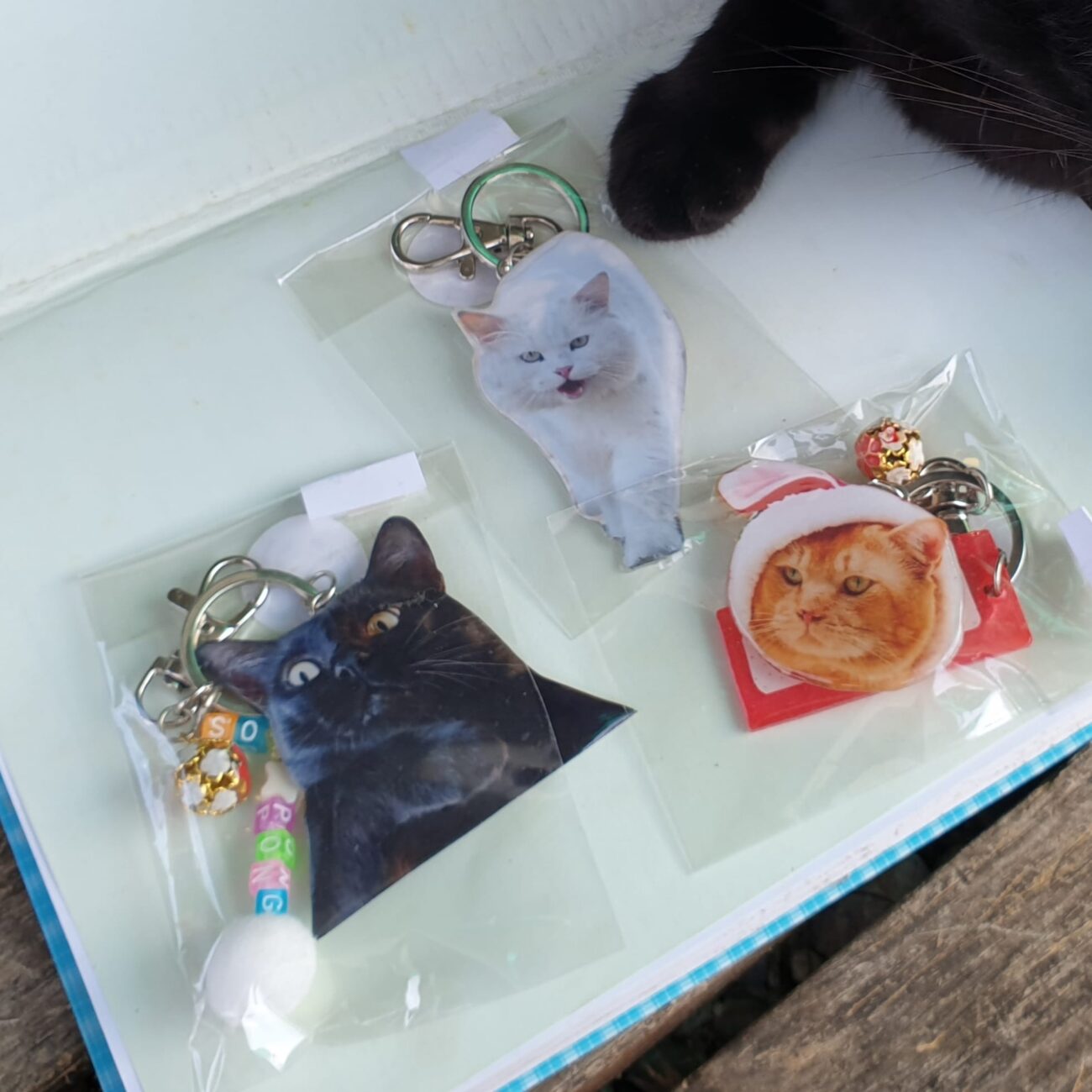 สินค้าอย่างหนึ่งก็จะเป็นสินค้าแฮนด์เมด ทุกคนสามารถส่งรูปแมวตัวโปรด (หมาหรือสัตว์เลี้ยงอื่น หรือคนด้วยก็ได้ครับ) มาทำพวงกุญแจเรซินกันน้ำน่ารัก ๆ ไว้สะสมเป็นที่ระลึก หรือใช้สอยตามปรกติ ราคาเริ่มต้นร้อยกว่าบาทครับ