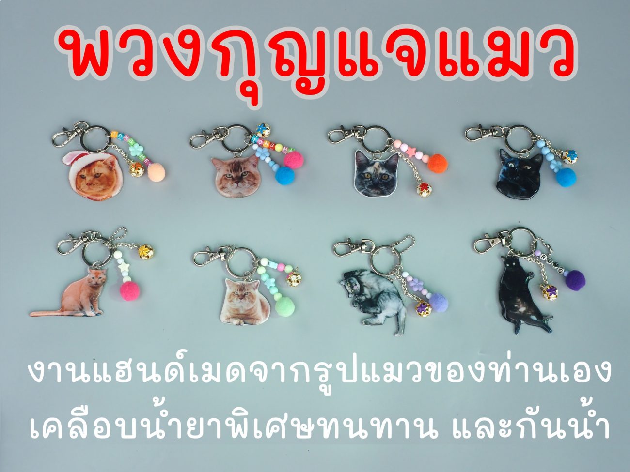 ทุกท่านสามารถนำรูปแมวของตนเองมาสั่งทำเป็นพวงกุญแจได้ตามต้องการ เพียงคัดเลือกรูปแมวที่คิดว่าสวยส่งมาเมื่อสั่งซื้อ หรือจะสั่งพวงกุญแจแมวในบ้านทองมีทองมีโดยตรงเลยก็ได้ตามตัวอย่างเลยครับ มีแมวให้เลือกคือ ทองมี ทองมา มะเหมี่ยว และดำรง