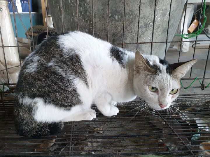 ตั้งแต่สาย พอได้เวลาเรียกแมวเข้าบ้าน แมวทั้งหลายก็เข้าบ้านกันหมด ขาดแต่สมสี่ตัวเดียว พ่อทองมีจึงออกตาม หลังจากหาไปทั่วจึงวนไปหาแถวโรงเก็บของใกล้กับที่พวกแก๊งหมาจรอยู่ เมื่อมองไปที่มุมหนึ่ง ตรงนั้นเอาไม้กั้นไว้เป็นห้อง ก็มีเสียงหวาน ๆ ร้องเรียกออกมา พอชะเง้อเข้าไปดูก็พบแมวสีขาวเทาตัวหนึ่ง หน้าตามอมแมม แต่เธอดูเชื่องมาก รีบเดินเข้ามาหา มาคลอเคลีย เอาหัวมาดันมือไปมา และให้อุ้มโดยง่ายครับ จากนั้นพ่อทองมีจึงอุ้มมาใส่กรงไว้ก่อน เพราะถ้าไม่ช่วยแล้วไปเจอหมาจรคงมีอันตรายอาจตายได้ หลังจากนั้นก็พาเข้ากรง ให้น้ำและอาหารครับ สรุปว่า “ผักกาด” เป็นแมวเพศเมีย สีเทาสลิดสลับกับขาว อายุยังไม่มาก เดาว่าน่าวัยรุ่นจะ 1-2 ปี เธอโดนคนใจร้ายพามาปล่อย เธอจึงร่อนเร่จนเข้ามาที่บ้านคนเพื่อขอความช่วยเหลือ โชคดีที่ผ่านด่านหมาจรมาได้ แต่หากปล่อยไว้ ผักกาดคงไม่น่าจะรอด เนื่องจากหมาก็เพิ่งกัดโคล่าน้อยของพ่อทองมีไปครับ ผักกาดจะหาบ้านครับ ปีนี้พ่อทองมีภาระหนักอึ้ง ท่านใดเมตตาก็จองได้ครับ พ่อทองมีจะกักตัวตามระยะ และพาตรวจโรคให้เรียบร้อยก่อนไปบ้านใหม่ครับ ผักกาดดูน่ารักนะครับ เดี๋ยวทำความสะอาดแล้วคงจะสวยขึ้นมากครับ (สมสี่และหนุ่มอื่น ๆ เข้าบ้านช้าผิดปรกติ คงได้กลิ่นสาว ๆ จึงออกตามหากัน ตอนนี้ทั้งหมดเข้าบ้านกันเรียบร้อยครับ)