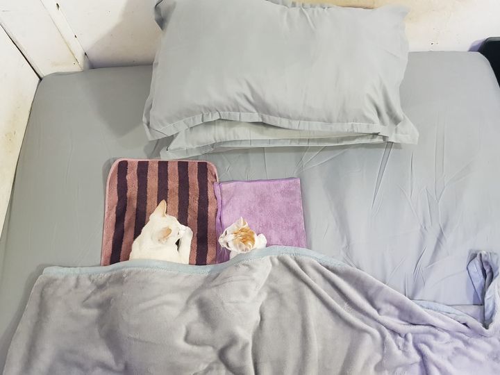 วันนี้เปลี่ยนชุดผ้าปูที่นอนใหม่ ที่ลืมไม่ได้คือต้องมีผ้าเดิมสองผืนปูไว้ด้วย ผืนแรกลายม่วงชมพูคือผ้าเน่าของกวางตุ้ง ผืนสองสีม่วงของส้มจี๊ด ทุกคืนพ่อทองมีจะนอนตรงกลางเตียง กวางตุ้งและส้มจี๊ดก็จะมานอนบนผ้าของเขา และโคล่าก็จะมุดเข้ามาแทรกกลางอีกที ส่วนพี่ ๆ แมวที่เหลือก็เลือกมุมกันตามสบายจนเต็มเตียง สำหรับห้องหนุ่ม ๆ ช่วงหลังจะไม่ได้ไปนอนด้วย แต่ก็จะต้องไปนั่งอุ้มนั่งหอมนั่งเล่านิทานให้ฟังทุกคืนครับ ไม่งั้นก็จะโวยวายไม่นอนกัน ชุดผ้าปูนี้เพิ่งซื้อมาใหม่ หลังจากชุดเดิมหมดสภาพเพราะใช้งานยาวนานและแมวก็เล่นกันจนขาดจนเปื่อยหมด แต่ระยะเวลาใช้งานนั้นมาเกินสิบปีแล้วก็ถือว่าคุ้มค่า แมวทั้งหมดในบ้านก็เคยได้มีประวัติศาสตร์ได้นอนผ้าปูมาทั้งหมดแล้วครับ พ่อทองมีใช้ชีวิตอยู่กับแมวง่าย ๆ แบบนี้ เวลาเหน็ดเหนื่อยจากเรื่องใดมา Safezone ที่ดีที่สุดก็คือได้นอนคุดกับแมวนั่นเองครับ