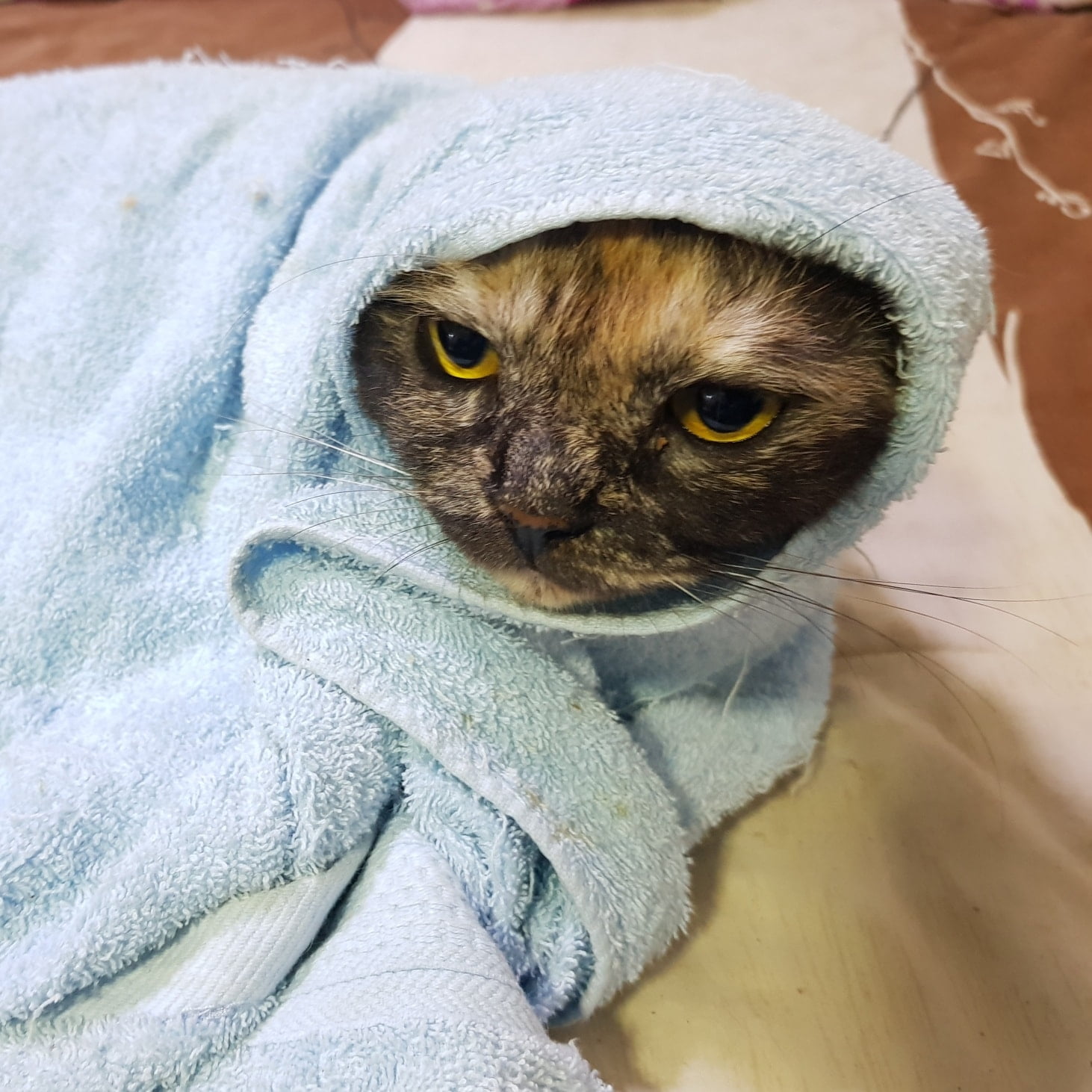 #มะเหมี่ยว ลงจากหลังคาและเข้าบ้านแล้วนะครับ เลยเวลาอาหารแล้ว คงหิวเลยลงมาเอง มานั่งรอให้อุ้มเข้าบ้าน ปรกติแก๊งสาวแสบหรือแก๊งหนุ่ม ๆ ก็ตาม หากขึ้นไปติดลมบนหลังคานาน วิธีเรียกคือใช้อาหารล่อ โดยหยิบอาหารซองและเคาะจาน พอได้ยินเสียงก็แทบบินลงมาเลยครับ ยกเว้นแต่แมวแก๊งสี่ปลา ซึ่งยังเล็กไม่คุ้นเคย กับมะเหมี่ยว มะเหมี่ยวนั้นรอบจัด รู้มาก ใช้แผนหลอกล่อไม่ค่อยได้ผล แต่ก็จะลงมาเองเมื่อร้อนหรือหิวแบบวันนี้ครับ มีแมวดื้อตอนแรก ๆ ก็โมโหนะครับ แต่พอนานไปคนเลี้ยงกลับปรับตัวไปเอง พ่อทองมีได้แต่ทำโทษเล็กน้อย เช่นจับห่อผ้าทำมัมมี่แล้วก็นั่งบ่นแป๊บหนึ่ง ซึ่งก็จะเข็ดหลาบ ไม่ทำแบบเดิมไปอีกหนึ่งวันครับ!