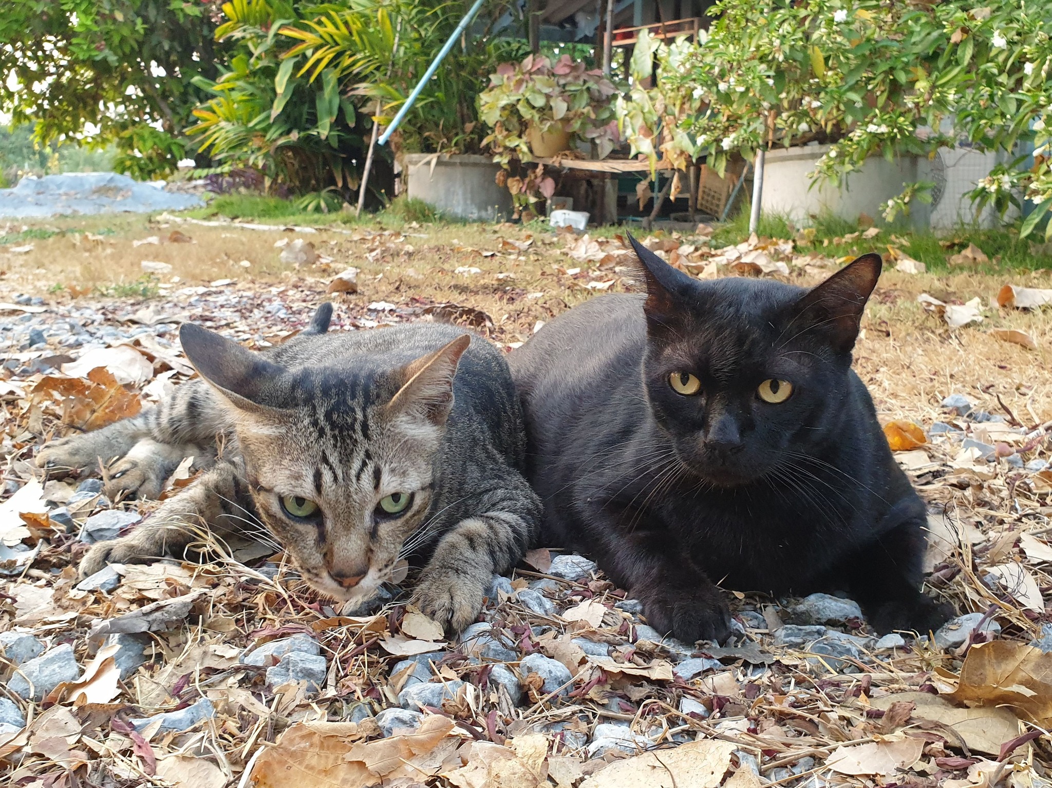 #ดำรง สดชื่นดีครับ วันนี้ดำรงตรวจร่างกายอีกรอบ อาการเจ็บป่วยของดำรงดีขึ้น แต่ก็ยังไม่หายขาดครับ คุณหมออัลตราซาวด์อีกรอบก็ยังพบตะกอนในกระเพาะปัสสาวะอยู่ ซึ่งก็ตรงตามที่พ่อทองมีประเมินเองจากการสังเกตคือ แม้ดำรงไม่นั่งเบ่งฉี่นาน ๆ และไม่เดินไปฉี่ติดต่อหลาย ๆ รอบแล้ว แต่ก็ยังฉี่ได้ไม่เหมือนแมวปรกติ (แมวปรกติใช้เวลาฉี่แป๊บเดียวก็เสร็จ) ดำรงยังนั่งฉี่นานกว่าพอให้เป็นจุดสังเกตได้ครับ รวมทั้งเรื่องอาหาร ดำรงยังกินได้น้อยกว่าปรกติอยู่ (เวลาแมวไม่สบาย มักไม่กินอาหาร เราสามารถใช้เป็นจุดสังเกตแมวในบ้านได้เป็นอันดับแรกครับว่าน่าจะเกิดสิ่งปรกติกับร่างกายหรืออาจเจ็บป่วยครับ) แต่ก็ถือว่าดีมากแล้วครับ จากวันแรก ๆ ที่ป่วย ดำรงจะไม่ยอมกินอะไรเลย ซึ่งคงต้องรอให้หายดีและร่างกายปรับตัว ดำรงน่าจะกลับมากินเยอะเท่าเดิมครับ สรุปว่า พ่อทองมีได้เบาใจขึ้น ดำรงอาการดีขึ้น แต่ก็ยังไม่หายขาด ยังต้องหาหมอต่อไป แต่ก็มีนัดห่างขึ้นทุกสามวัน โดยยาต่าง ๆ ยังต้องกินต่อ และอยู่บ้านต้องให้น้ำเกลือทุกวันครับ ในรูป ดำรงเดินออกจากบ้านมานั่งเล่นกับพี่กระรอก นั่งดูน้อง ๆ วิ่งเล่น วันนี้ดำรงออกเดินเล่นรอบบ้านได้ซึ่งเป็นสัญญาณที่ดีครับว่ากำลังกลับมาร่าเริงเหมือนเดิม จากหลายวันที่ผ่านมาจะนั่งกับนอนเสียส่วนใหญ่ครับ