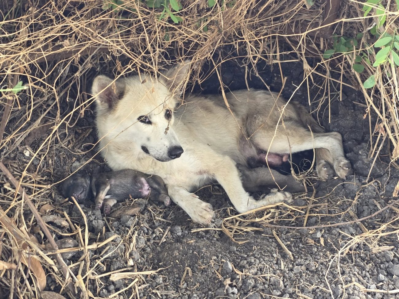 วันนี้แม่สวยกับลูก ๆ ปลอดภัยดีครับ แต่ยังหวงลูกมาก ไม่ยอมให้ใครเข้าใกล้ วันนี้พ่อทองมีหาตาข่ายมาล้อมเพื่อป้องกันสัตว์ร้าย และเตรียมกรงรอไว้ เผื่อจับตัวได้ก็จะพาเข้ามาอยู่บริเวณทันทีครับ ชีวิตหมาจรหรือแมวจรนั้นไม่ใช่ง่ายเลยครับ พวกเขาไม่มีบ้าน ไม่มีคนดูแล ไปเจอบ้านไหนพอมีอาหาร มีที่หลบแดดหลบฝนก็จะขออาศัยอยู่ หากเจอคนรังเกียจหรือไล่ทุบตีก็ต้องร่อนเร่ต่อไป ซึ่งแม่สวย (และหมาจรอื่นอีกสองตัว) นั้นโชคดี มาเจอบ้านทองมีซึ่งไม่มีใครรังเกียจหรือทำร้าย ทั้งสามจึงวนเวียนอาศัยไม่ไปไหน แม่สวยนั้นก็เจียมเนื้อเจียมตัว คงไม่อยากให้บ้านที่เมตตาให้ข้าวให้น้ำต้องเดือดร้อน เมื่อรู้ว่าตัวเองจะมีลูก จึงไปแอบขุดโพรงดินไว้บริเวณป่าห่างบ้านออกไปเพื่อคลอดลูก และโชคดีที่เราตามไปเจอและเธอกับลูกยังปลอดภัย พ่อทองมีนั้นมีภาระกับแมวมากมายแล้ว แต่เมื่อมีชีวิตใหม่มาเกิดในเขตบ้านก็นิ่งดูดายไม่ได้ คงต้องพยายามดูแลเขาให้เต็มที่โดยเฉพาะอาหารการกินช่วงแม่หมาต้องให้นม เมื่อวานก็มีแฟนประจำช่วยอาหารมาสองสามท่าน ซึ่งก็ช่วยแบ่งเบาได้ครับ ต้องขอขอบคุณแทนแม่สวยกับลูก ๆ ครับ ช่วงนี้พ่อทองมีก็จะพยายามดูแลความปลอดภัยแม่กับลูกจนกว่าจะพาเข้าบ้านได้ครับ