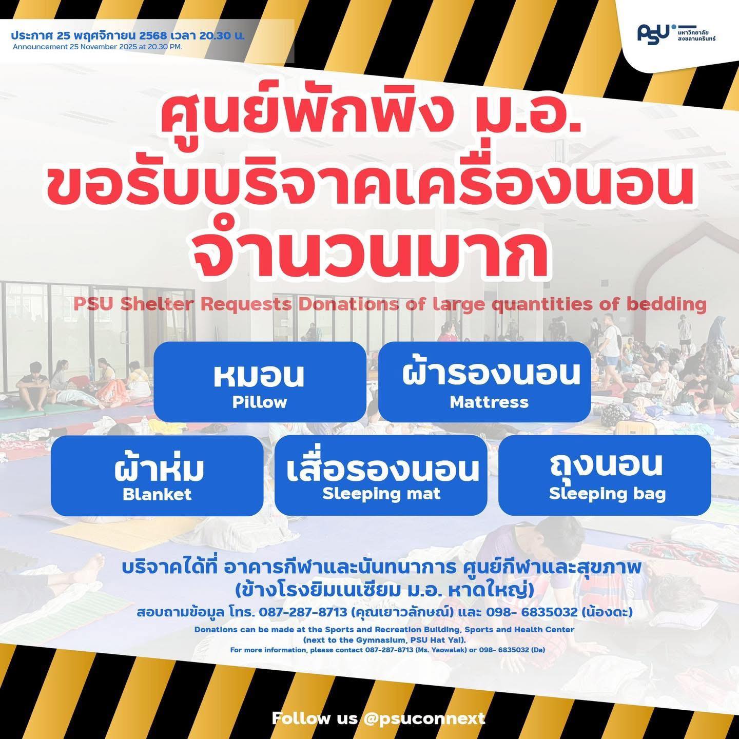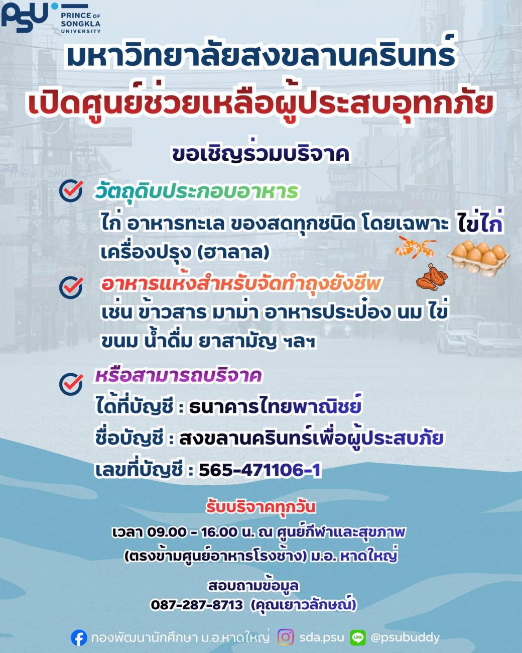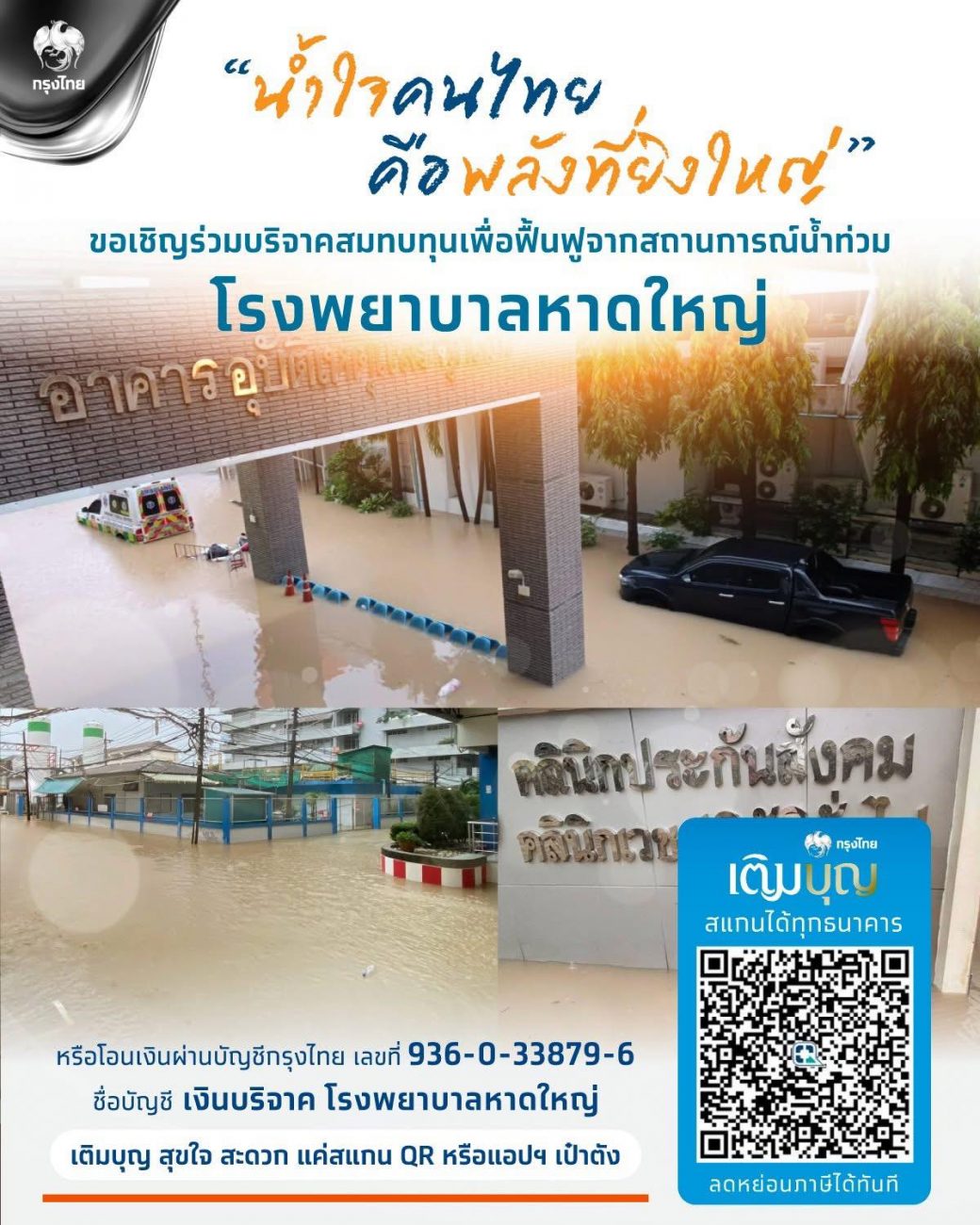 ใครต้องการบริจาคข้าวของหรือเงินให้กับผู้ ประสบภัยที่หาดใหญ่ โพสต์เมื่อ 26 พ.ย. 2025 - 10:54น. ใน โพสต์ทั่วไป 0 คอมเมนต์ ใครต้องการบริจาคข้าวของหรือเงินให้กับผู้ ประสบภัยที่หาดใหญ่ สามารถบริจาคได้ตามช่องทางต่อไปนี้เป็นช่องทางอย่างเป็นทางการของทางมหาลัยและทางธนาคาร ดูโพสต์ในเฟซบุ๊กShare พิมพ์ 0 Likes