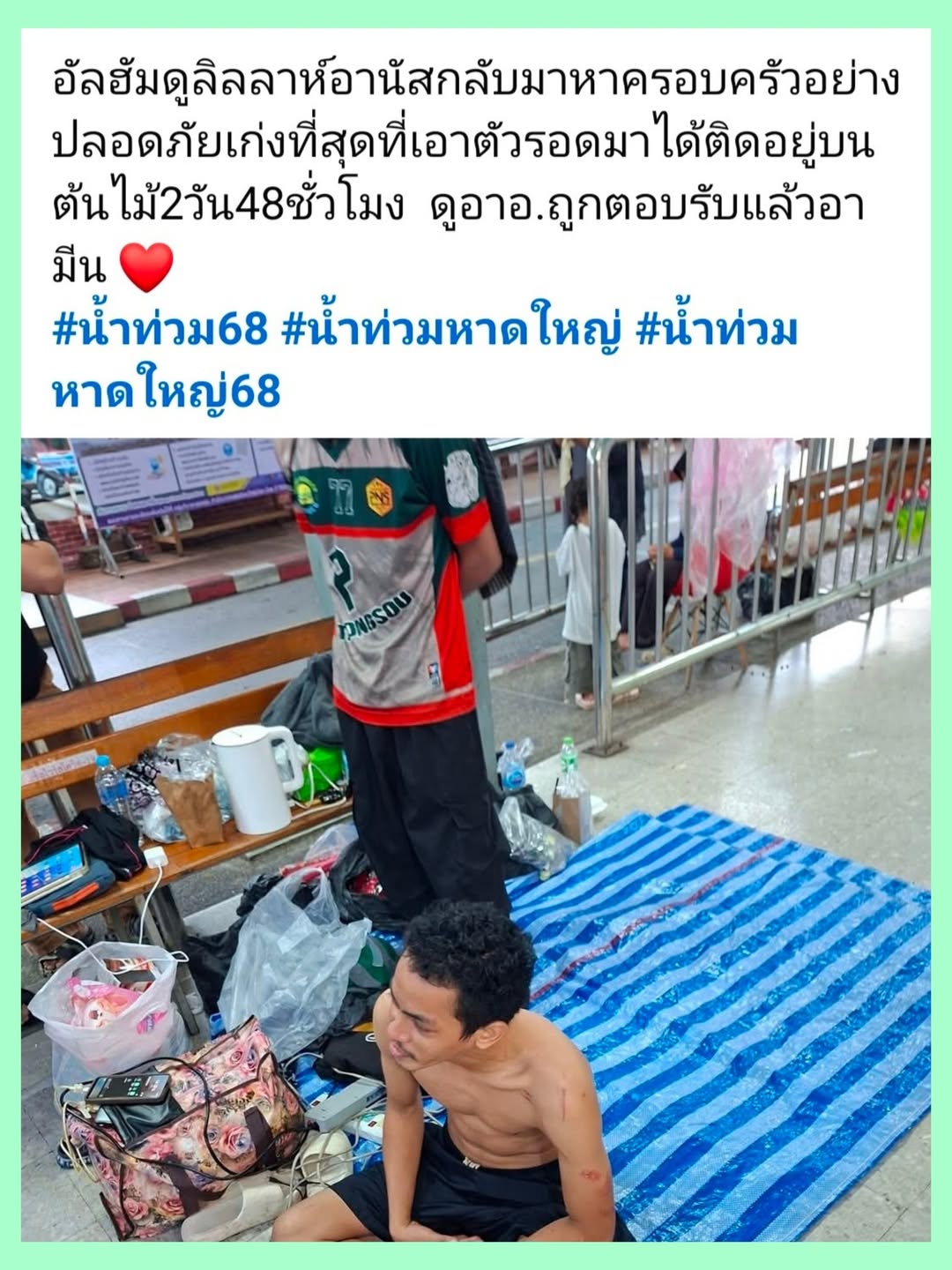 เมื่อวานที่แชร์โพสต์ของพี่ที่ประกาศตามหาน้องชายที่หายไปกับน้ำท่วม วันนี้ #เจอตัวแล้วและปลอดภัยดีครับ น้องชายที่หายต้องปีนหลบบนต้นไม้ถึงสองวันเต็ม ขอแสดงความยินดีกับพี่ชายและครอบครัวด้วยอย่างยิ่งครับ ที่น่าคิดคือพี่ออกตามหาและได้ไปหาน้องจากศพผู้เสียชีวิตน้ำท่วมด้วย สมมุติหากเป็นตัวเราและดันพบว่าคนที่เราหานั้นเป็นหนึ่งในศพที่กำลังดูอยู่ มันคงยากจะทำใจนะครับ #น้ำท่วมหาดใหญ่ ครั้งนี้คือการสูญเสียครั้งใหญ่ หลายครอบครัวต้องเสียคนที่รักไปรวมทั้งแมวหมาและสัตว์อื่นอีกเกินจะนับ วันนี้มันคือฝันร้าย แต่มันจะไม่อยู่กับเราไปตลอด ขอเป็นกำลังใจให้ทุกชีวิตในหาดใหญ่ครับ