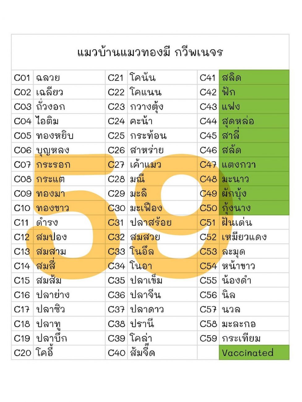 เลข 59 ไม่ได้ใบ้หวยนะครับ เป็นจำนวนของลูก ๆ พ่อทองมีในวันนี้ครับ พ่อทองมีมีเรื่องอยากจะเล่าเกี่ยวกับแมว 2-3 เรื่องด้วยกัน แต่วันนี้ขอเป็นเรื่องจำนวนแมว 59 ตัว ก่อนครับ พอดีวันนี้นั่งลิสต์รายชื่อว่าแมวเรามีเท่าไรแน่ เพราะแมวเก่าไปแมวใหม่มาอยู่บ่อย ๆ เวลาแฟนเพจถามในบ้านมีแมวเท่าไรก็ได้แต่ตอบกว่าเกินครึ่งร้อย แต่จากนี้ใครถามก็ตอบได้เป๊ะแล้วว่า 59 ตัว และจำนวนนี้ขออย่าให้ลดลงเลย หากจะเพิ่มก็ขอให้เพิ่มแค่ตามแผนที่ตั้งใจครับ แมวทั้งหมดในบ้านมีชื่อตามในรูปครับ โดยมีแมวแก่ที่สุดในบ้านคือ 2 ชื่อแรก ยายทวด “ฉลวยกับเฉลียว” ทั้งคู่เป็นพี่น้องกันและอายุจะครบ 20 ย่าง 21 ปี หลังปีใหม่นี้ ทุก ๆ ปีใหม่พ่อทองมีก็นั่งลุ้นว่ายายทั้งคู่จะผ่านพ้นคืนปีใหม่ไปได้ไหม เพราะทั้งคู่อายุมากแล้ว อยากให้สองยายอยู่กับพ่อทองมีไปนานแสนนาน แต่ทั้งคู่ก็แก่มาก ๆ ปีนี้เริ่มแสดงอาการความแก่ชราออกให้เห็นได้ชัดครับ และสำหรับแมวเด็กสุดในบ้านก็คือ “ผักบุ้งกับกุ้งนาง” เด็กของแถมจากอยุธยานั่นเอง ทั้งคู่อายุประมาณ 3-4 เดือนครับ วันมะรืนก็ปีใหม่แล้ว วันหยุดยาวปีใหม่ปีนี้พ่อทองมีไม่ได้ไปไหนเหมือนหลายปีที่ผ่านมา ช่วงนี้จะยุ่งต่ออีกหลายวันกับภารกิจเกี่ยวกับแมวคือจัดการเรื่องความเป็นอยู่ของแมว พาแมวบางตัวที่ไม่สบายหาหมอ และทำวัคซีนแมวด้วยครับ การทำวัคซีนแมวในบ้านแมวทองมีใช้สองวิธีคือ – แมวมาใหม่หรือแมวเด็ก ปีแรกจะพาไปหาหมอตรวจร่างกาย ลงประวัติ และทำวัคซีน เนื่องจากแมวใหม่ไม่มาก พาไปหาหมอก็ไม่ได้ลำบากอะไร – แมวเก่าหรือแมวโตในบ้าน พ่อทองมีจะสั่งวัคซีนจากหมอมาฉีดเอง เนื่องจากสะดวก การพาแมว 50 กว่าตัวไปทำวัคซีนนั้นเหนื่อยมาก เพราะรถหนึ่งเที่ยวจะวางกรงแมวได้ 4-5 กรง กว่าจะครบก็เหนื่อยมากครับ สำหรับแมว 59 ตัวในปัจจุบันเป็นแมวใหม่/แมวเด็กที่ทำวัคซีนกับหมออยู่ 9 ตัว จึงเหลือ 50 ตัวที่จะต้องสั่งวัคซีนมาฉีดเอง วัคซีนที่ฉีดก็จะเป็นวัคซีนบังคับคือวัคซีนรวมหัดหวัดแมวและวัคซีนพิษสุนัขบ้า (มีวัคซีนอื่นด้วยบ้างตามสมควรเช่นลูคีเมีย) โดยราคาประมาณ 150 บาทต่อเข็ม แมวหนึ่งตัวฉีด 2 เข็ม เป็นเงิน 300 บาทต่อตัวต่อปี ท่านใดเป็น FC แมวตัวไหน อยากทำบุญปีใหม่ช่วยค่าวัคซีน พ่อทองมีก็ยินดีนะครับ แมวทุกตัวจะได้ทำวัคซีนและได้แบ่งเบาภาระลงไปได้ครับ ช่วงนี้หลายท่านกำลังเดินทางไปท่องเที่ยวหรือกลับภูมิลำเนา ขอให้ทุกท่านเดินทางโดยสวัสดิภาพครับ พ่อทองมีช่วงนี้จะยุ่งบ้างเพราะติดภารกิจกับแมวทุกวัน แต่จะแบ่งเวลามาเขียนเล่าเรื่องที่เหลือครับ ขอบคุณ