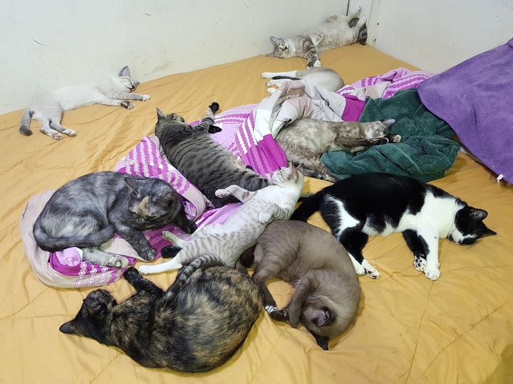 สุดสัปดาห์ ล้าอ่อน ก็นอนพัก มีลูกรัก รอฟัด เหมือนนัดหมาย คอยออดอ้อน นอนเคียง อยู่เรียงราย หลับสบาย บอกกัน ว่าฝันดี #แมว #กลอน (เตียงนี้คือเตียงนอนของพ่อทองมีนะครับ เมื่อก่อนเคยอายว่านอนกับแมวยั้วเยี้ยไปหมด แต่เดี๋ยวนี้ขาดแมวไม่ได้เลยครับ คิดเหมือนพวกเขาคือลูก คือครอบครัว ทุกคืนเรานอนกอดกันมีความความสุขมากครับ แต่ก็ต้องสลับไปนอนห้องหนุ่ม ๆ ด้วยนะครับจะไมได้ไม่งอนกัน)