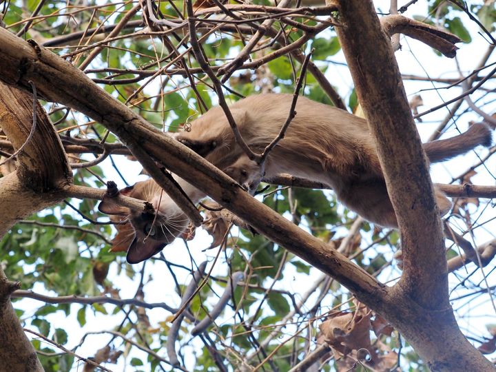มีเรื่องเล่าของ #โนอึล หน่อยครับ เมื่อเย็นวาน เมื่อได้เวลาเข้าบ้าน แมวที่ออกไปเดินเล่นก็พากันเดินกลับบ้านตามปรกติ เหลือแต่ตัวแสบโนอึล ยังไม่สะใจ เธอวิ่งหนีขึ้นต้นไม้ต่อ เรียกก็ไม่ยอมลง ผ่านไปไม่นาน บนต้นไม้ในรูปนี้ครับ เธอก็ร้องลั่นแล้วปีนลงมาแบบไม่คิดชีวิต เมื่อมองขึ้นไปจึงเห็นว่าตัวแตนบินไล่อยู่ เธอโดนแตนต่อยนั่งเอง พ่อทองมีจึงรีบจับมาอุ้มเข้าบ้านทันที ขอบตาขวาโนอึลริ่มบวมขึ้นมานิด ๆ พ่อทองมีเตรียมตัวจะพาเธอไปหาหมอ แต่โนอึลก็กระโดดขึ้นเตียงแล้วก็ร้องโหยหวน เรียกพ่อทองมีให้ไปกอดและนอนปลอบใจ พอจะขยับตัวเพื่อเตรียมตัวพาไปหาหมอ เธอก็ร้องอีกไม่ให้ไปไหน จึงต้องนอนกอดจนเธอหลับไป เมื่อดูอาการ ตาก็ไม่ได้บวมขึ้น จึงเบาใจได้หน่อย หากไม่ดีก็จะพาหาหมอทันที แต่ผ่านไปไม่ถึงชั่วโมง โนอึลก็ตื่นขึ้นมา และก็ดีดไปทั่วห้องเหมือนเคย สรุป – โนอึลโดนแตนต่อยเลยอ้อนและฟ้องใหญ่ โนอึลก็ทรหดมากครับ ไม่ได้เป็นอะไร หวังว่าต่อไปจะเลิกปีนต้นไม้หรือซนน้อยลงครับ