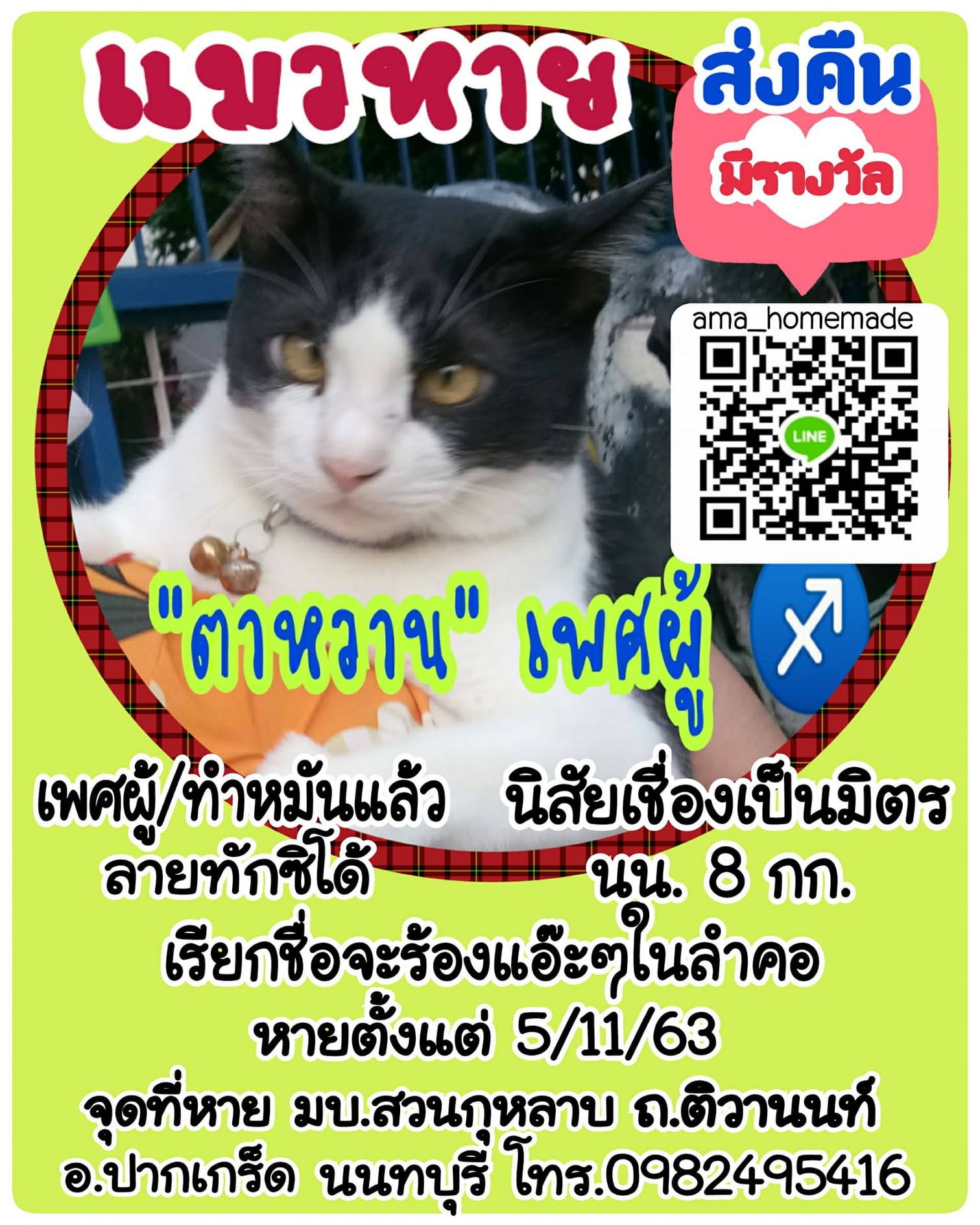 #แมวหาย “ตาหวาน” แมวเพศผู้ ทำหมันแล้ว สีขาวดำตามรูป นิสัยเชื่อง เป็นมิตร เป็นแม โพสต์เมื่อ 24 พ.ย. 2020 - 12:44น. ใน โพสต์ทั่วไป 0 คอมเมนต์ #แมวหาย “ตาหวาน” แมวเพศผู้ ทำหมันแล้ว สีขาวดำตามรูป นิสัยเชื่อง เป็นมิตร เป็นแมวตัวใหญ่ หนัก 8 ก.ก. เวลาเรียกชื่อจะร้องแอ๊ะ ๆ ในลำคอ ตาหวานหายออกจากบ้านไปตั้งแต่ 5 พ.ย. 2563 จุดที่หายคือ หมู่บ้านสวนกุหลาบ ถ. ติวานนท์ ปากเกร็ด นนทบุรี ท่านใดพบเห็น ติดต่อ – โทร: 098-249-5416 – ไลน์ ID: ama_homemade หรือสแกน qr code ในรูป – เฟซบุ๊ก: facebook.com/snowii.narak ดูโพสต์ในเฟซบุ๊กShare พิมพ์ 0 Likes