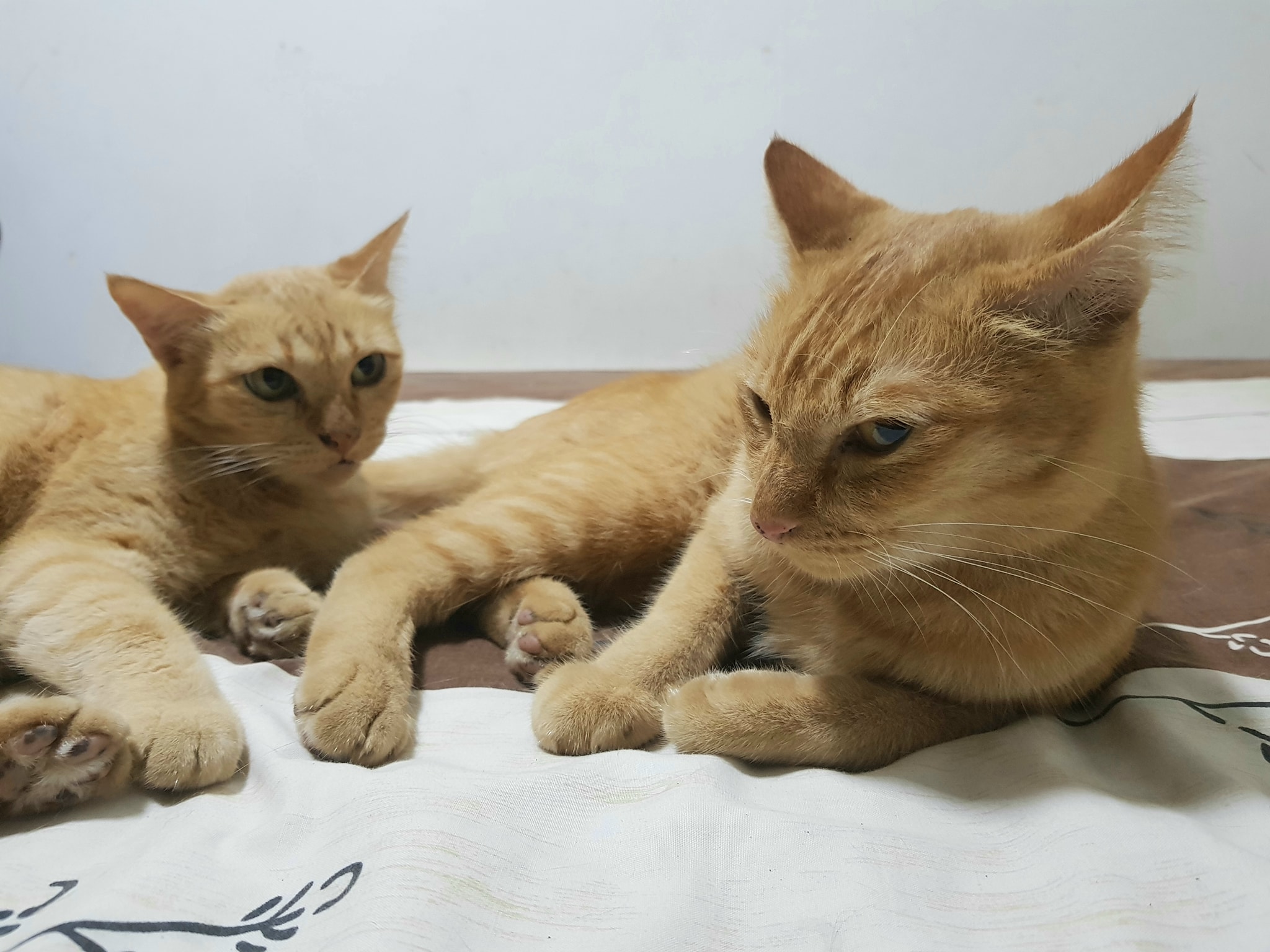 #ทองหยิบ (ขวา) #ทองกวาว (ซ้าย) #แมว #กลอน (ทองหยิบตัวแสบ แอบไปจับหนูจับกบตามคลองอีกแล้ว วันนี้กว่าจะเจอก็สองทุ่มกว่า เจอตัวก็อ้อนใหญ่ เลยจับให้อยู่กับแม่ทองกวาวให้สั่งสอนบ้าง ปรากฏว่านิ่งเลย ถ้าเป็นคนคงโดนแม่ตีแล้ว แม่ทองกวาวนิสัยนิ่ง เรียบร้อย แต่ดุ จึงเอาอยู่ แต่ฝากกับทองมีก็ไม่ได้ ทองหยิบนิสัยเดียวกันกับพ่อสมัยหนุ่ม ๆ เลย มีแมวมากก็ต้องรับผิดชอบมากขึ้น เลยเหนื่อยมาก นี่สาเหตุที่หาบ้านให้เด็กชายข้าวเหนียวครับ เราไม่สามารถรับแมวมาดูแลแบบไม่จำกัดได้ แม้สงสารเขา บ้านทองมีเลี้ยงแมวแบบมีเวลาเช้าถึงสาย และบ่ายแก่ถึงก่อนค่ำ ให้พวกเขาออกวิ่งเล่นตามสบาย โดยมีคนดูห่าง ๆ แต่แมวมีมากจึงมีบ้างพวกแอบย่องไปเที่ยวบ้าง ต่อไปคงจะขยายตาข่ายคล้ายซาฟารีย่อม ๆ ให้เที่ยวเล่นกันข้างใน เวลาคนยุ่งก็ไม่ต้องห่วงครับ)